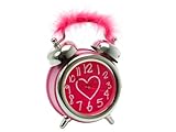 Alarm clock with fluffy pink handle. Pink face with contrasting white numbers. Measures Features: Fluffy pink handle, Pink face, Contrasting white numbers, Measures 6 by 3 by 8-Inch, Requires 2 AA batteries (not included) Read More