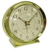 The Baby Ben Classic remains true to its handsome original 1964 design with an ivory-colored molded case and a brass-plated metal base and bezel. The ivory dial with brown numbers and hands is protected by a shatterproof acrylic lens. The hands have white luminous centers that glow in the dark for easy night viewing. Although this clock is compact at 3-1/2 inches wide by 3-3/8 inches high, its 1/4-inch hour numbers are easy to read. Designed to rest on a nightstand, table, desktop, or on the floor next to your bed, this alarm clock works for home, travel, camping, or wherever ac or battery powering is not available. To turn the alarm on, you pull the alarm knob out. When the alarm time is reached, an old-fashioned bell sounds for about 10 seconds unless the alarm knob is pushed in to silence the alarm. As long as the alarm knob is pulled out, the alarm will sound again in 12 hours at the set time. Features: Authentic 1964 Baby Ben Classic, Keywound Time and Bell Alarm, Luminous Hands for Night Viewing, Brass Metal Bezel, Base and Knobs, Almond Molded Case Read More